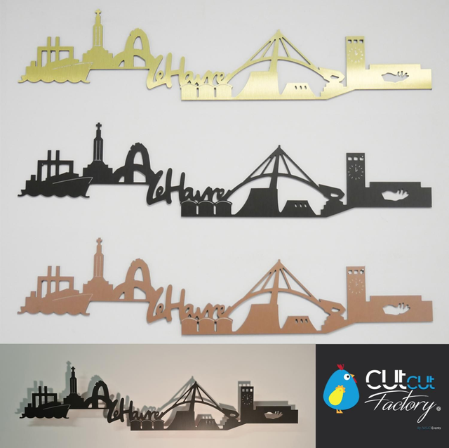 Skyline représentant Le Havre en dibond brossé de 70 cm de long par 16 cm de haut pour 3 mm d'épaisseur.